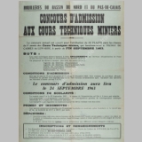 Houillères du bassin Nord-Pas-de-Calais : affiche annonçant le concours d´admission aux cours techniques miniers, 1963. ANMT, Fonds des Charbonnages de France, 2004 001 V1 317 |